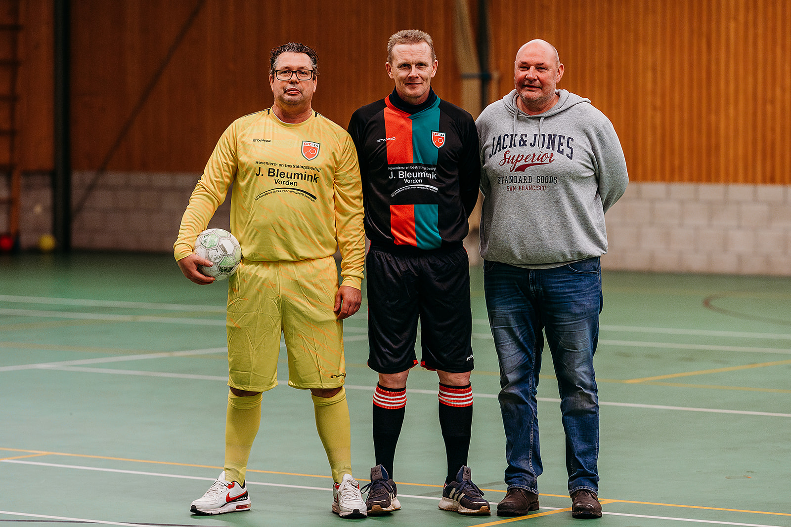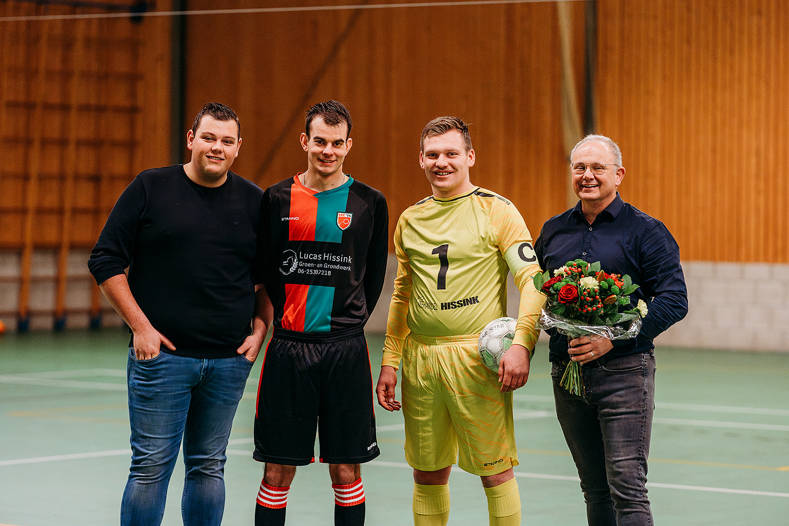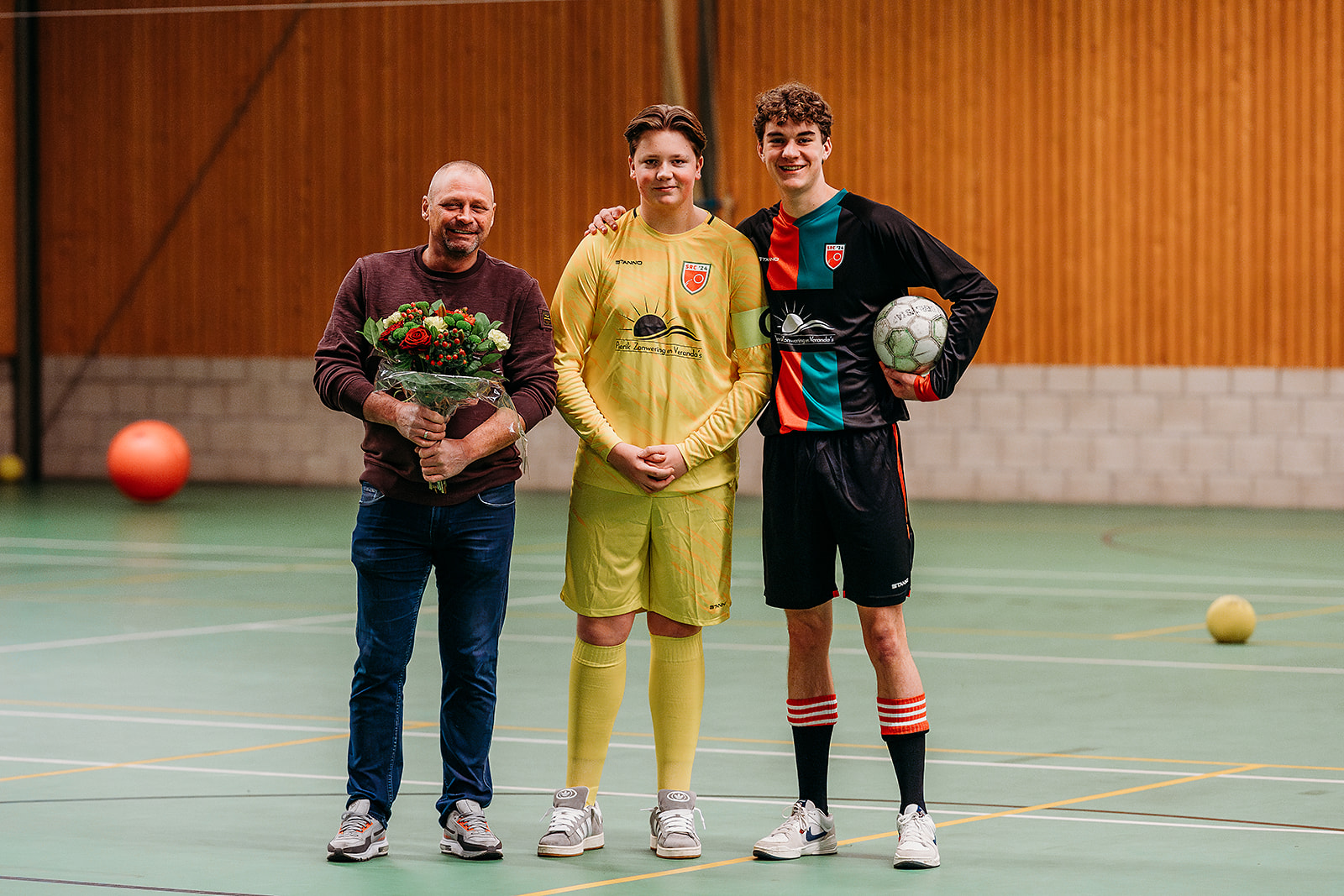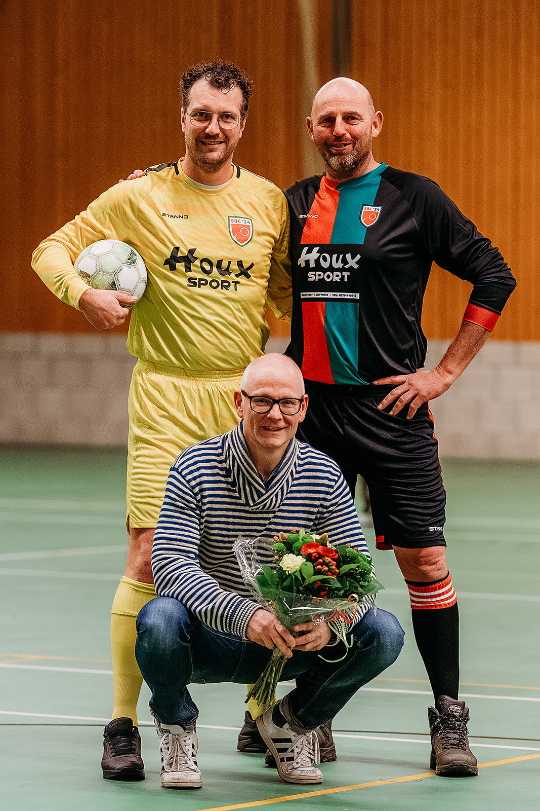 Rond 15.00 uur was het dan aan de sponsorcommissie om het nieuwe tenue te onthullen. Voorzitter Mario nam eerst nog het woord om Henry Vreeman te bedanken voor zijn bewezen diensten. Henry gaat een stapje terug doen, maar had nog wel als doelstelling om alles rond het nieuwe tenuete regelen. En ondanks dat het even geduurd had, was alles tot in de puntjes geregeld en daarvoor werd hij ook terecht in het zonnetje gezet. Dennis Spiegelenberg en Henry Vreeman gingen daarna, namens de sponsorcommissie, over tot de onthulling. Voor dat dit echter ging plaatsvinden werd eerst duidelijk gemaakt dat SRC’24 op de site een link heeft naar een Webshop. Daar kan men kleding en spelmaterialen bestellen, om onze sporten voetbal, tennis en volleybal uit te kunnen oefenen. Naast deze materialen is er ook een aparte kledinglijn geselecteerd voor SRC’24. Deze zijn ook via de Webshop te bestellen, echter voor diegene die niet kon wachten, was Ruud Houx aanwezig met de volledige kledinglijn in alle maten. Dus konden de aanwezigen al direct een bestelling plaatsen.